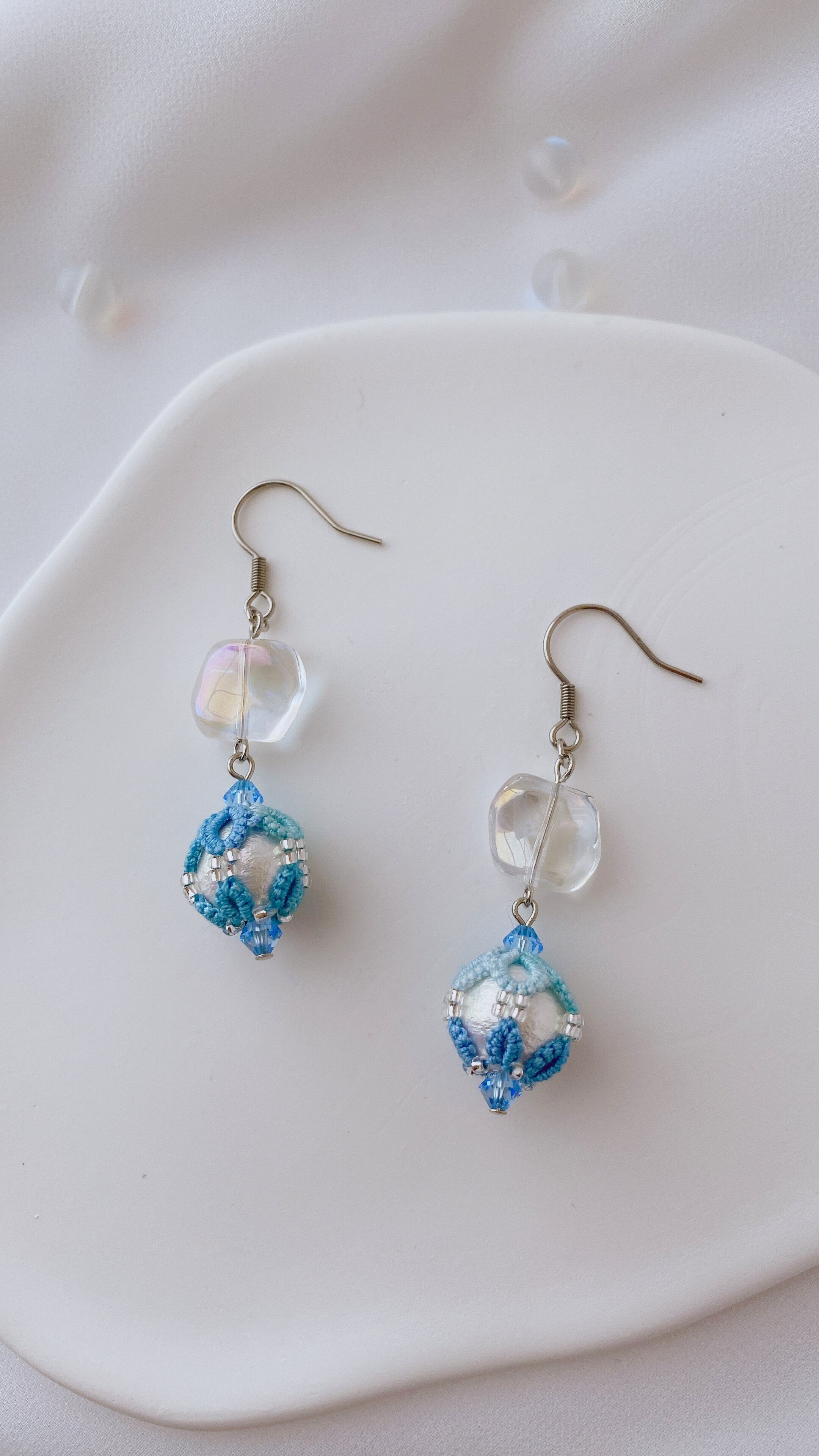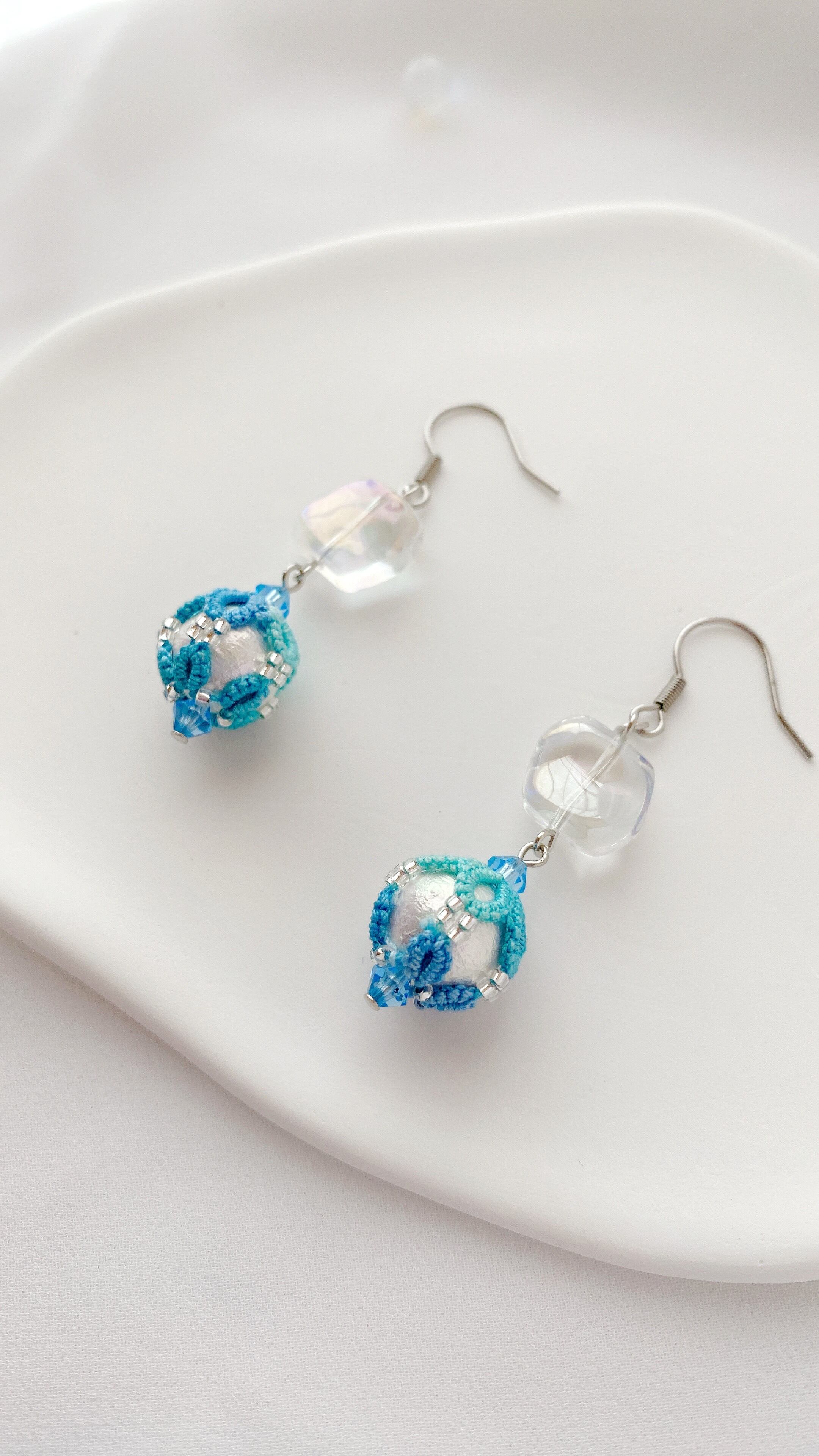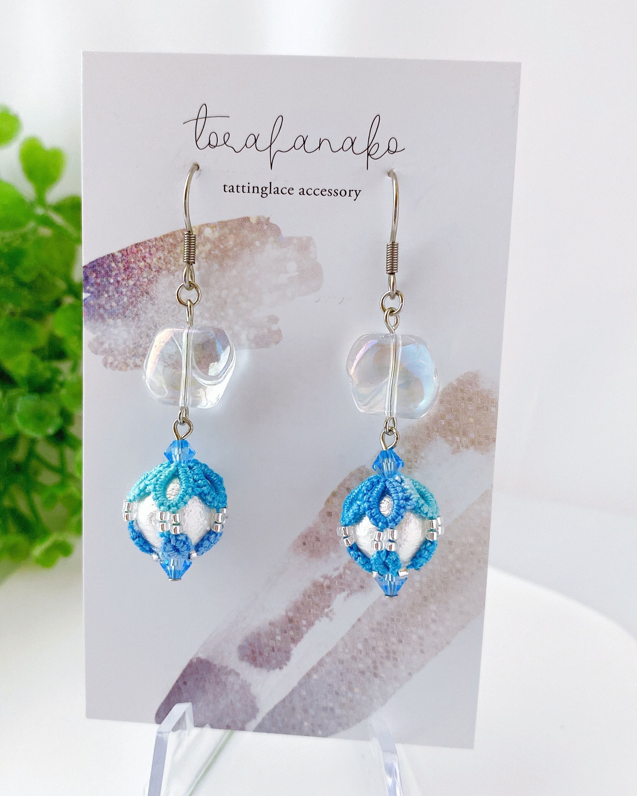 10㎜コットンパールにタティングレースを編み包んだピアスです。