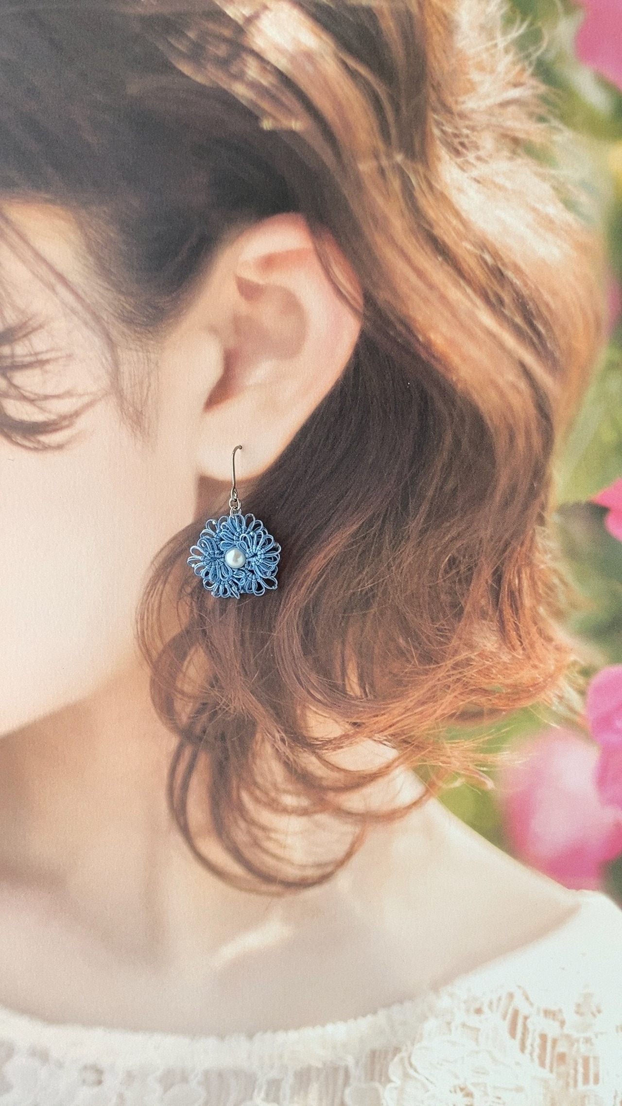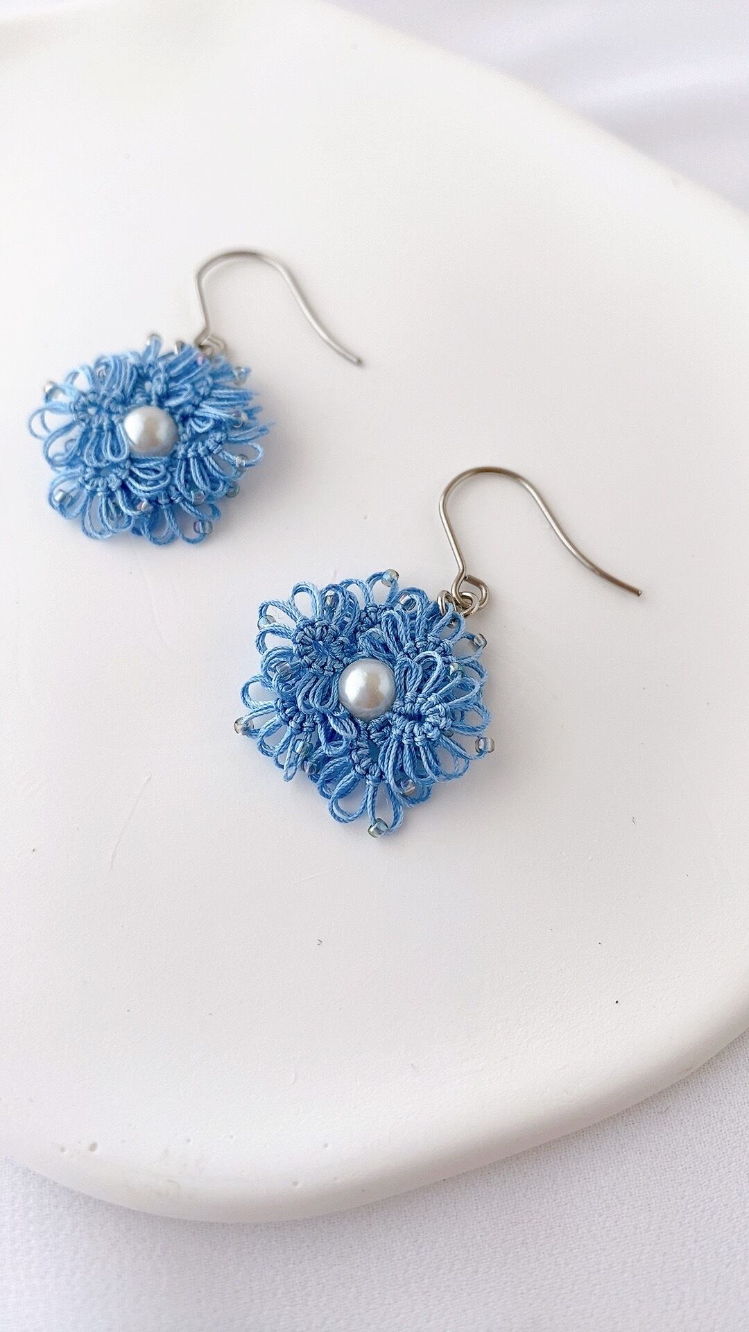 優しい色合いの2色の青いレース糸を重ねて編んだフラワーモチーフのタティングレースピアスです。
